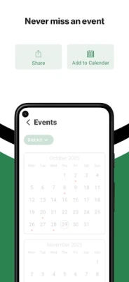 The event section shows a list of events throughout the district. Users can add an event to their calendar to share the event with friends and family with one tap.